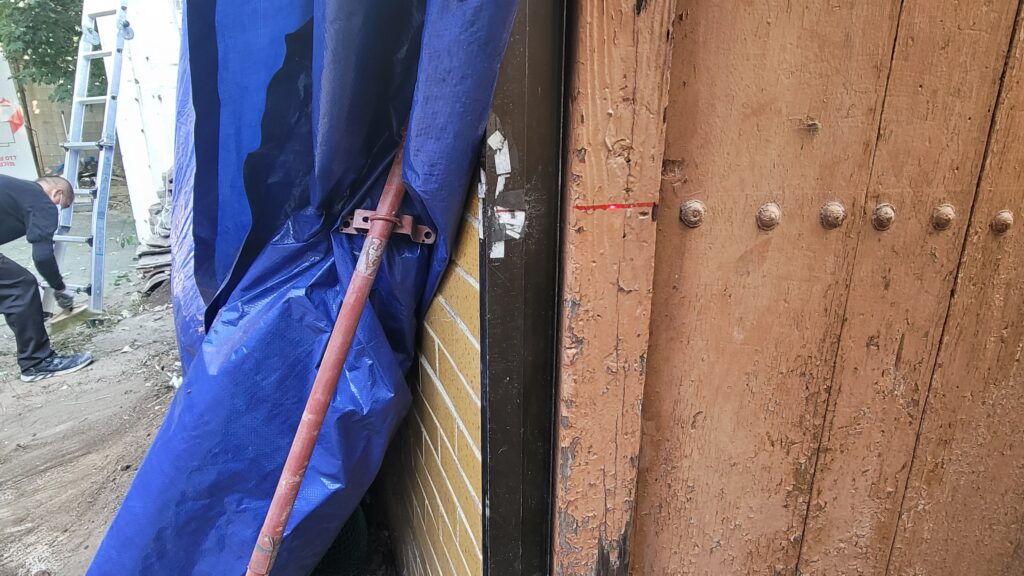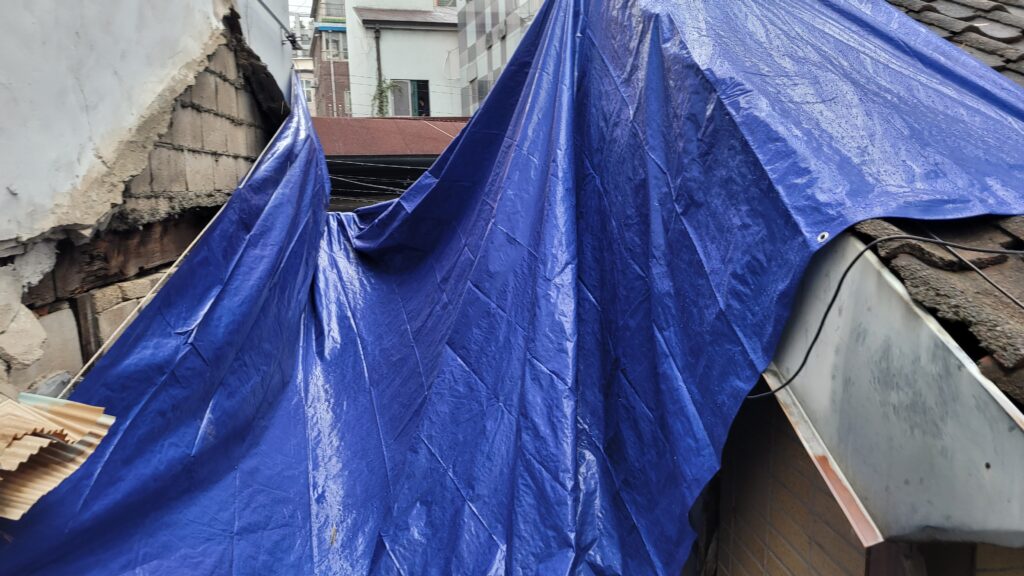 60년 된 종로 집수리 이야기가 본격적으로 시작된다. 공사를 위해 허물어지지 직전의 건물을 아래와 같이 가리기로 했다. 먼지나 안전을 위해서도 필요하지만 너무 흉물이라서 가리는 작업을 먼저 하는 것이다.