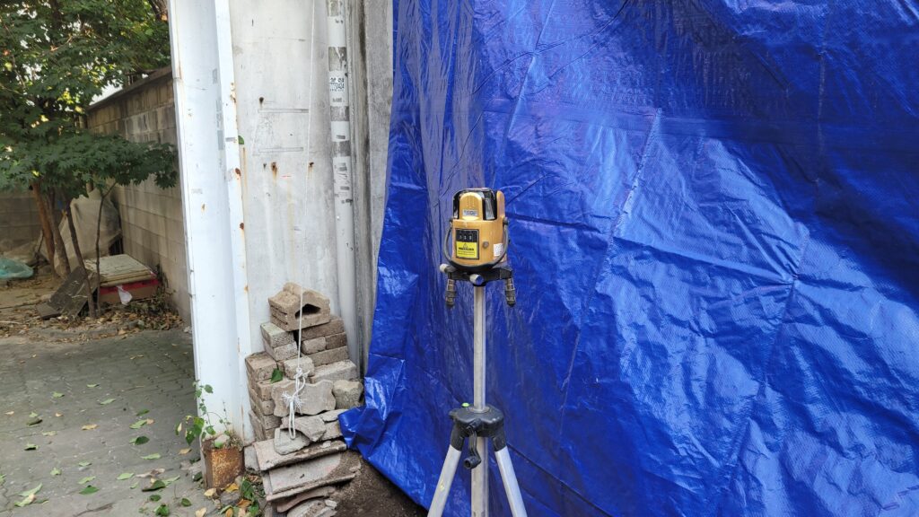 기둥 세울 곳을 정하고 위와 같이 땅을 파고 pvc 관을 세운다. 이때 pvc 관의 높이는 레벨기로 정한 기준선을 중심으로 정해진 높이로 한다. 아래 그림은 표시한 기준 섬을 중심으로 높이를 맞추는 과정이다.