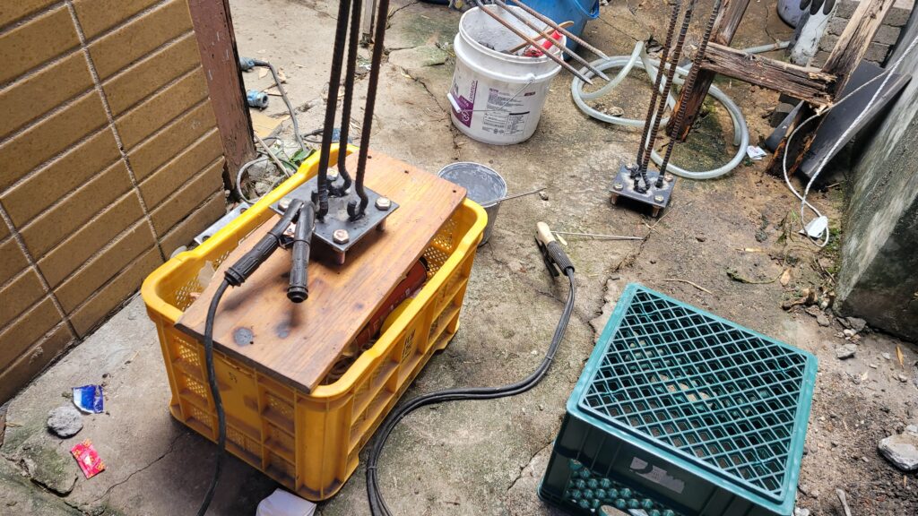 베이스 판 설치는 다양하게 할 수 있지만 이곳은 여건상 위와 같이 하기로 했다. 기동이 세워질 곳 기반에 대한 확실한 정보가 있다면 더 깊게 기초를 할 수도 있고, 장비를 이용해 박을 수도 있다. 그러나 중요한 것은 기초 철근을 아무리 깊이 박아도 땅에 노출된다면 언제 간 부식이 되어 효과를 다 볼 수 없을 것이다. 때문에 반드시 pvc 관에 시멘트를 채우는 작업을 해야 한다.